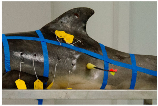 Remote biopsy of marine mammals is often performed using a crossbow (or modified air rifle), and dart-delivered biopsy punch (reviewed in [1]). The majority of published remote biopsy methods describe the use of a dart-mounted biopsy punch to remove a conical plug of skin and blubber (e.g., see illustration in [6]), ideally excised at the level of the subdermal fascia at the moment of impact. The dimensions of the biopsy punch used is chosen to suit the blubber thickness of the target species. For example, for common bottlenose dolphins the biopsy punch size may range in width from 5 to 10 mm and in length from 9 to 40 mm (reviewed in [1]). To prevent penetration into the muscle tissue underlying the subdermal fascia, each remote biopsy dart is designed with a rigid backstop that assists with dart rebound on impact, at which point the obtained sample can be collected for processing. For small cetaceans such as common bottlenose dolphins, the target area on the body described by some researchers for sample collection is high on the lateral side of the animal, just below the dorsal fin [7,8,9,10] and above the transverse processes of the vertebrae, where substantial epaxial muscles lie underneath the subdermal fascial plane [11].