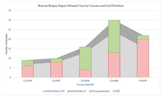 Remote biopsy wound classification for each carcass by grid partition. Grid partitions on each carcass were A, B, C, D, and S. Grid partitions A–D were defined as non-target areas and S was defined as the target area of each carcass. OP = over-penetration, defined as a wound penetrating through the subdermal fascia into muscle tissue; NSE = no visible subdermal effect, defined as a wound with no over-penetration.