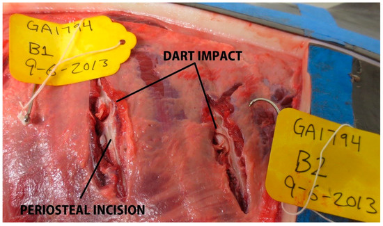 One notable exception to the innocuous observations in support of remote biopsy was that by the Tethys Research Institute where darting resulted in the death of a common dolphin (Delphinus delphis) in the Eastern Ionian Sea [35]. This accidental death was thought to be the result of a complex series of factors. The dolphin in question was a 162 cm sub-adult with an unusually thin blubber layer (7 mm). This dolphin was sampled from a typical distance of 6 m with a dart calculated to carry significantly less energy than that used in this study [27,36], however the dart did not rebound and was found to penetrate deeply into the dorsal musculature, causing suspected vertebral trauma [35]. No darts were found to impact the ends of the transverse processes of the spinal vertebrae in this study, though this may be a possible scenario for bottlenose dolphins due to the limited tissue depth covering the transverse processes, and the proximity of some dart impacts (~1 cm). The post-impact skeletal damaged observed here is likely due to the difference in the way fixed structures with low surface areas, like ribs, absorb energy relative to soft tissue [37]. The carcass tissue appeared to dissipate some energy to the impact area before the dart rebounds (see the impact “crater” around the biopsy dart in Figure 3), yet this energy is likely not dissipated as well if the dart impacts a more rigid part of the body (e.g., over a rib). Several instances of significant over-penetration in all animals tested here resulted from impacts in grid partition A, B, and C, but the resulting damage in those grid partitions increased for the sub-adults (GA1794 and GA1817) and underweight animal (PA1031). Damage to ribs in the sub-adult dolphins was more severe, and the results from PA1031 suggest that an animal appearing underweight should be avoided for sampling, as even well-placed shots in grid partition S (the target area) over-penetrated.