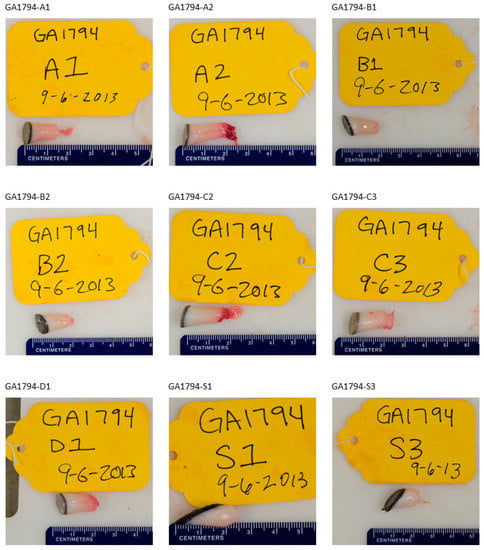Prior to sampling, all carcasses were positioned perpendicular to the sampler at table height (ventral recumbency), except for carcass (PA1031), which was placed on the floor to better simulate the angle of sampling in the field. A grid constructed of masking tape was applied to each carcass and each grid partition was assigned an alphabetical identifier (A, B, C, D, and S, Figure 2). Grid partition “S” was intended to approximate the area on the carcass targeted by other researchers in the field [7,8,9]. The shooting range in the laboratory was marked at 3 to 5 m from the sampler to the carcass. Biopsy collection darts were fired beginning at 5 m within each grid partition marked on the carcass, and in most cases each grid partition was sampled again at 3 or 4 m (except for PA1031, sampled only at 5 m distant). The range of 3 to 5 m for sampling was chosen because other researchers report sampling common bottlenose dolphins within a similar range and changes in dart speed and energy are negligible in that range [27]. Paper identification tags corresponding to the sample label (e.g., GA1794-A1) in each grid partition were affixed to the wound using a fishhook (Figure 3). Carcasses GA1794, GA1817, GA1838, and GA1846 were sampled on their left sides with the Barnett Panzer V (draw weight 68 kg, power stroke 31.8 cm), while carcass PA1031 was sampled on the right side with the MK-150A2 crossbow (draw-weight 68 kg, power stroke 26.7 cm), reported as slightly less powerful than the Panzer V crossbow [27]. After each event, photographs were taken of the resulting external wound, the sample collected, and the sampling end of the dart.