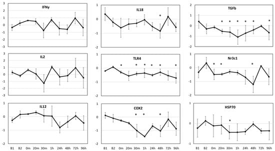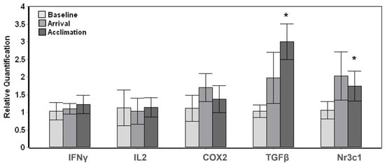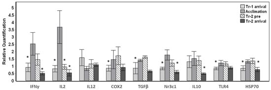 | T/NEnv (Aquarium whales) | Transported whales (n = 7) | IFNγ, IL2, IL12, COX2, TGFβ, Nr3c1, IL10, TLR4, HSP70 | Transport-1 arrival Transport acclimation Transport-2 pre Transport-2 arrival | 5 | August–September 2008 September 2008–April 2009 April–May 2009 April–May 2009 |