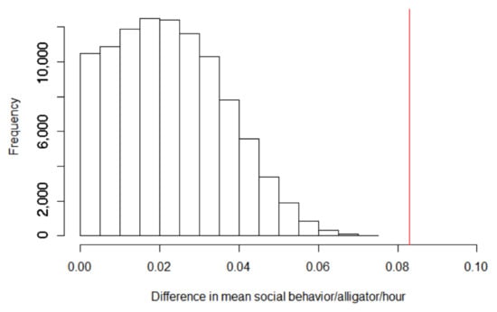 Frequency histogram of the 100,000 permutations of difference in mean social behavior/alligator/hour. This parameter was calculated by subtracting the mean number of social behaviors per alligator per hour in the captive congregation from the same value in the wild congregation. The permutations are created by randomly resampling the observed data to create hypothetical mean social behavior/alligator/hour for each congregation and the difference in means between congregations is calculated. All 100,000 permutations were higher than the observed difference in means (red vertical line at 0.083).