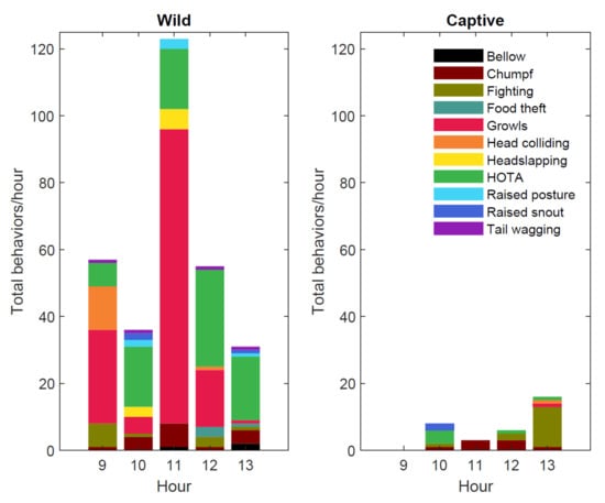 Total number of specific social behaviors (color-coded) during each hour of the day summed across days. The social behavior of the wild congregation is represented on the left and the social behavior of the captive congregation on the right. The y-axis limits are the same for both plots to facilitate comparison of the frequency of social behaviors between the wild and captive congregations. Proportions of general behaviors performed within the wild and captive congregations can be found in Table 1.