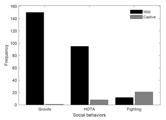 Social behaviors were consistently observed more often at the wild site than the captive site (Figure 2 and Figure 3; Table 1). In particular, growls and HOTA were observed more often in the wild congregation than the captive (Figure 4). The wild congregation also exhibited a more diverse social behavior repertoire compared to the captive congregation (Figure 3; Table 1). More general behaviors were observed in the captive congregation, but the increase in the performance of general behaviors resulted from the prevalence of a single behavior, high walking, which dominated the behavioral repertoire of the captive congregation (Figure 5 and Figure 6; Table 2). Contrary to high walking, flushing occurred more often in the wild congregation. The frequency of behavioral events of the captive congregation was influenced by human presence (Figure 8).