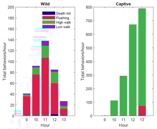 At the wild site, a total of 422 general behaviors were recorded. The most frequently observed general behavior within the wild congregation was flushing (72.27% of general behaviors; n = 305 at the wild site and 2.70% of general behaviors; n = 74 at the captive site), which most often occurred at the same time as human visitor presence at the Deep Hole site. The death roll behavior was recorded at the wild site while no instances were observed at the captive site (n = 3 at the wild site and n = 0 at the captive site). At the captive site, 2736 general behaviors were recorded. The most frequently observed general behavior within the captive congregation were individuals performing high walks (Figure 5; Table 2). In total, 1973 individual instances were observed of high walking (72.11% of general behaviors; n = 1973).