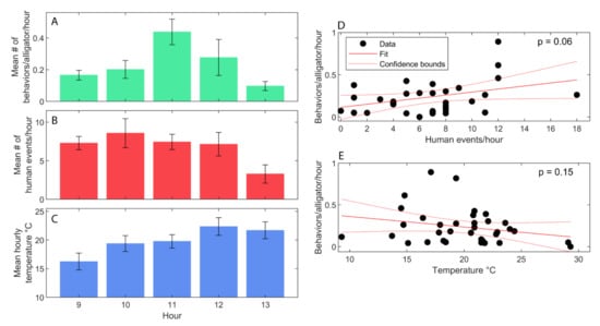 A comparison of trends in behavior, human interactions, and temperature by hour in the wild congregation. (A) The mean (±SE) number of behaviors (including social and general) divided by group size per hour by hour of day. (B) The mean (±SE) number of human events (including humans walking near the water or kayaking) per hour by hour of day. (C) The mean (±SE) hourly temperature (°C) by hour of day. (D) Relationship between the frequency of alligator behavior compared to the frequency of human events. The solid line represents a fitted linear model with the dashed lines representing the 95% confidence interval. (E) Relationship between the frequency of alligator behavior compared to the air temperature. The solid line represents a fitted linear model with the dashed lines representing the 95% confidence interval.