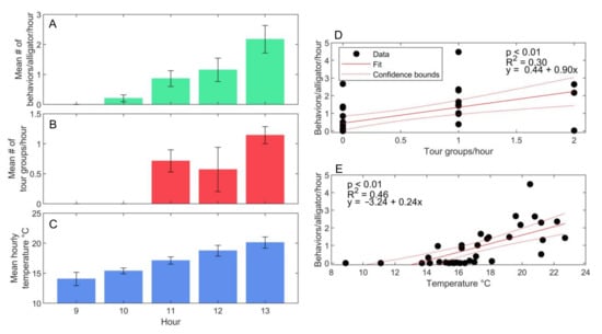 A comparison of trends in behavior, human interactions, and temperature by hour in the captive congregation. (A) The mean (±SE) number of behaviors (including social and general) divided by group size per hour by hour of day. (B) The mean (±SE) number of tour groups per hour by hour of day. (C) The mean (±SE) hourly temperature (°C) by hour of day. (D) Relationship between the frequency of alligator behavior compared to the frequency of tour groups. The solid line represents a fitted linear model with the dashed lines representing the 95% confidence interval. (E) Relationship between the frequency of alligator behavior compared to the air temperature. The solid line represents a fitted linear model, with the dashed lines representing the 95% confidence interval.