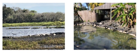 (a) The basking area of the wild site. (b) The basking area of the captive enclosure, showing the typical spacing of individual alligators during basking hours.