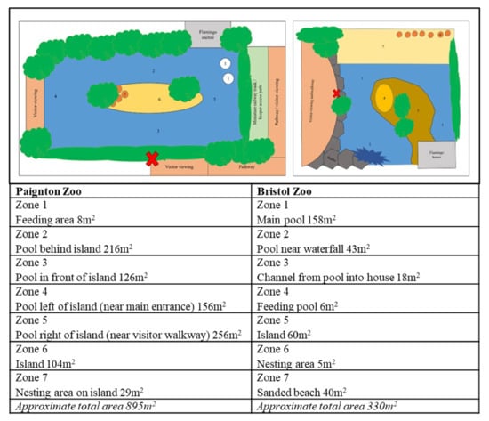 Each enclosure was divided into zones based on the biological relevance of space and resources to the flamingos (i.e., exhibit features that could be accessed and used by the flamingos for specific activities). These zones were measured as discrete sections of the overall enclosure area (