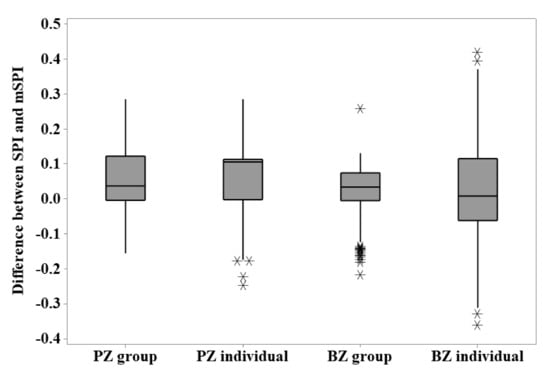The output from a one-sample sign test showed that when comparing the BZ mSPI group median (SPI = 0.71) to the individual mSPI values, more individual mSPI values were higher than the group median (214/288). Similarly, significantly more individual mSPI values from PZ (223 out of 252) were higher than the group mSPI median value (SPI = 0.6068). When comparing SPI values from BZ, significantly more individual SPI values were higher (190 out of 288) than the group median value (SPI = 0.73). At PZ, significantly more individual SPI values were higher (185 out of 252) than the group median value (SPI = 0.73).