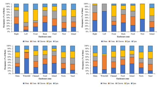 Figure 5). Birds may be deliberately moving away from the nesting area when they have completed their incubation duties (handing over to a partner) or non-breeding birds are actively avoiding areas where aggressive, breeding adults are situated. Consideration of animal physiological states and how these fluctuate seasonally and temporally is key to understanding the meaning behind enclosure usage data, especially if modifications to an exhibit are planned to improve the diversity of space use after observational data have been collected.