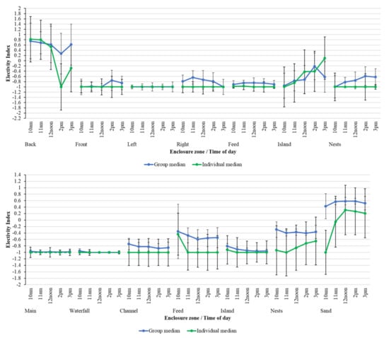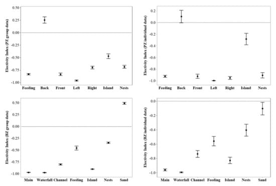 Figure 5), with only the back pool at PZ and the sanded beach area at BZ (but only for group data) showing an overuse. No equal usage of enclosure zones was demonstrated from these EIs, in a similar pattern to the picture provided from SPI data (