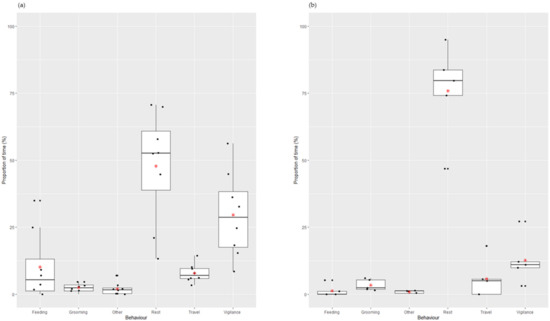 Proportion of time (%) the (a) male study subject and (b) female study subject engaged in each behavioural category throughout the data collection period. Time budget displayed using boxplots outlining the first quartile, median, third quartile and range of the data. Jitter plots used to visualize each collected data point represented by black circles. Red star denotes the mean value of time spent engaging in each behavioural category.