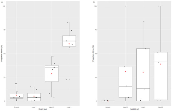 Proportion of time (%) the (a) male study subject and (b) female study subject spent at different height levels whilst in the indoor habitat. Height use data displayed using boxplots outlining the first quartile, median, third quartile and range of the data. Jitter plots used to visualize each collected data point represented by black circles. Red star denotes the mean value of time spent utilizing each height.