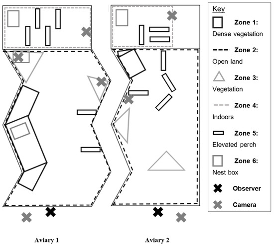 Enclosure layout for Aviary 1 (left) and Aviary 2 (right) with habitat zones and observer and camera positions highlighted in the key.