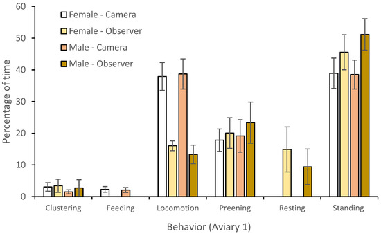 State behavior of pheasant pair housed in aviary 1 (+/− standard deviation), as compared between observer and camera conditions.
