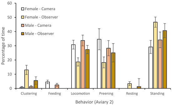 State behavior of pheasant pair housed in aviary 2 (+/− standard deviation), as compared between observer and camera conditions.