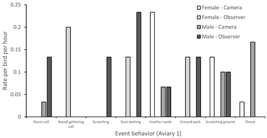 Rate of event behavior of pheasant pair housed in aviary 1, as compared between observer and camera conditions.