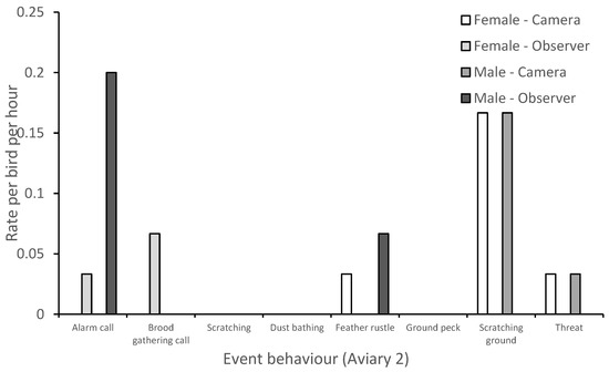 Rate of event behavior of pheasant pair housed in aviary 2, as compared between observer and camera conditions.