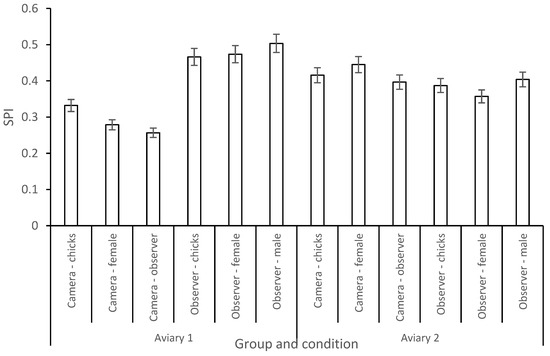 SPI values for birds in both aviaries (+/− standard deviation), compared between observer and camera conditions.