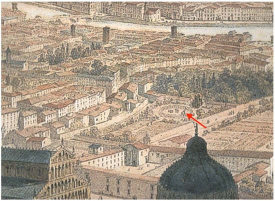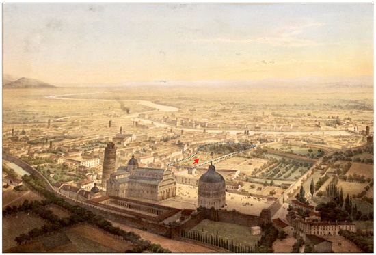 We carefully examined a drawing by Alfred Guesdon (1808–1876), named “Pise. Vue prise au dessus du Campo Santo”, part of a book edited by Etiennez [13]. The vista is a meticulously rendered aerial perspective of the whole town of Pisa. Guesdon drafted it in 1849, allegedly from a hot-air balloon anchored just north of the Campo Santo (holy ground or cemetery), at the northern boundary of the famous “Piazza dei Miracoli”, the square where the Leaning Tower of Pisa stands. The vista includes the Botanic Garden of Pisa.