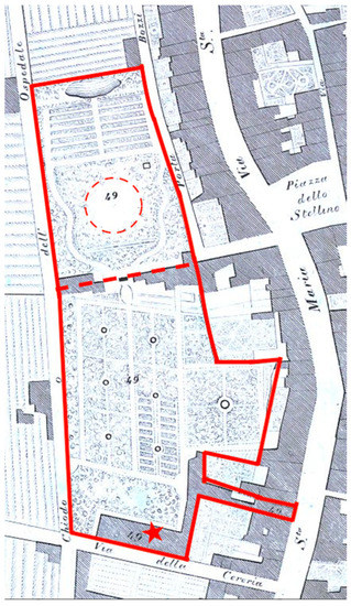 A detail of Van Lint’s map of Pisa (1846) showing the Botanic Garden (red solid line). North is up. The “Orto Nuovo” lies above the red dotted line; the red dashed circle shows the position of the giraffe enclosure within the “Orto Nuovo”; the red star marks the Natural History Museum building at the southern boundary of the Botanic Garden.
