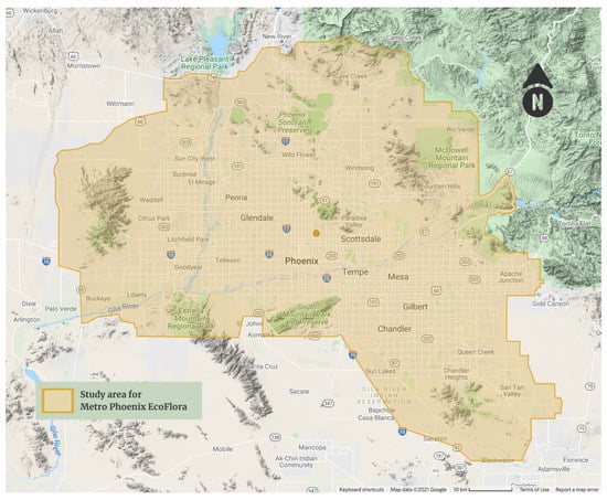 The EcoFlora program at DBG is known as the Metro Phoenix EcoFlora (MPE). It began in February 2020 and operates within the CAZCA initiative (Section 2.2). The study area includes metro Phoenix (AZ, USA) and is estimated to cover 2700 square miles (4300 square kilometers) (Figure 1). MPE prioritizes community engagement and collaboration, emphasizing that awareness is the first step in increasing appreciation of plant life and environmental literacy, thereby fostering public involvement in conservation []. The project collaborates with scientists, organizations, and community members in events, communications, resources, and data collection. Additionally, the iNaturalist observations and information gathered in the metro Phoenix area complement existing floristic data in the Southwest Environmental Information Network (SEINet; https://swbiodiversity.org/seinet/ accessed on 15 February 2022) and the DBG herbarium collections.