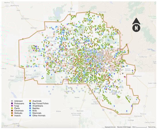 iNaturalist observations provide a wealth of data and information at a scale not achievable by professional scientists alone []. Since February 2020, project members have made 64,702 observations of 2990 species, with plants accounting for 40,333 observations of 1365 species (Figure 3, accessed on 11 June 2022). MPE project member observations make up 39% of the total number of observations of all taxa in the metro Phoenix area. For comparison, there are 32,653 plant occurrence records in metro Phoenix in SEINet, dating to the 1800s (accessed on 7 March 2022). The observations made on iNaturalist are currently being compared to the occurrence records in SEINet to understand more about plant biodiversity. A checklist of species has been created by combining SEINet occurrence records with species that also have observations on iNaturalist in the metro Phoenix area (https://swbiodiversity.org/seinet/checklists/checklist.php?clid=24132&emode=0 accessed on 7 March 2022).
