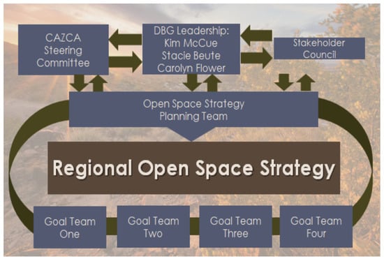 The shared vision is encapsulated in the Regional Open Space Strategy for Maricopa County (ROSS; Section 1.2), which outlines the vision itself (for a regional network of natural open spaces that serve both environmental and community needs) and the objectives that the partner organizations outlined as necessary to realize that vision []. Through CAZCA, DBG served as the primary facilitator and organizer of the collaborative process that produced the ROSS. This included 18 months of stakeholder processes involving more than 80 meetings with 30+ partner organizations. The first phase of the ROSS planning process involved the identification of regional goals (Figure 4), and the second phase involved the planning team breaking into goal-focused groups that created the underlying objectives (Figure 5). The goal teams met more than 30 times, and the larger planning group met more than 40 times during this process. Since its completion, the ROSS has led to regional planning and collaboration outcomes, including: (1) the development of tools from shared resources; (2) increased collaboration around large-scale challenges, such as habitat connectivity and land acquisition; and (3) the successful launching of regional conservation efforts, such as landscape-scale mapping and management of invasive plant species.