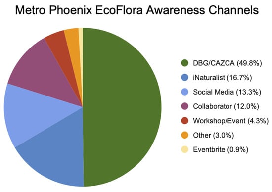 Social media and digital communications can effectively contribute to biodiversity knowledge and conservation efforts [,]. MPE virtually engages people through social media on Instagram (Menlo Park, CA, USA), Facebook (Menlo Park, CA, USA), and Twitter (San Francisco, CA, USA), with a combined total of 1317 followers. The majority of followers are in the United States, but others come from around the world. The project has had a combined reach of 15,102 unique accounts who saw content at least once from May 2020 to 14 February 2022 (accessed on 14 February 2022). One Facebook post in March of 2021 reached 2000 people with information concerning how extreme drought in Arizona may have been affecting wildflowers. EcoQuestions sessions and other resources are recorded and posted for viewing on YouTube (San Bruno, CA, USA) and have amassed 2232 views (accessed on 11 June 2022). The Metro Phoenix Field Guide is the digital monthly project newsletter that includes EcoQuest information, project events, volunteer opportunities, and project resources. The newsletter also provides a way for collaborators to share events and research efforts. There were 1631 contacts on the newsletter mailing list as of 14 February 2022.