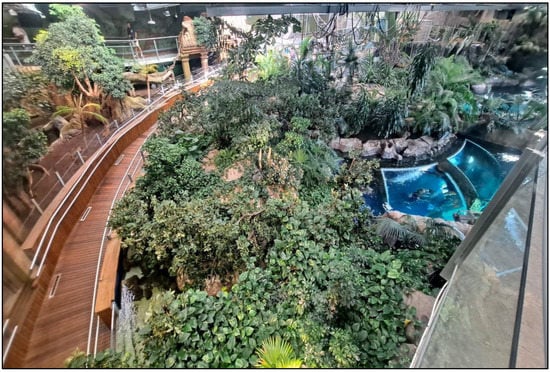 This study was developed at Biodomo—Parque de las Ciencias de Granada (Av. de las Ciencias. s/n. Granada, Spain; https://www.parqueciencias.com/biodomo (accessed on 10 September 2022)). Biodomo is a zoological and botanical facility inaugurated in 2016, which recreates terrestrial and aquatic habitats of the equatorial and tropical regions of the globe (Figure 1). Terrestrial ecosystems correspond to the Amazon rainforest, Southeast Asia and Madagascar; aquatic ecosystems represent fluvial, mangrove, coastal, and marine ecosystems. The present study focuses on the terrestrial multispecies enclosures of Biodomo, which house different animal and plant species living together, creating an ecosystem where they coexist in balance. With a total volume of 18,000 m3, a total surface of 4252 m3 and total exhibit surface of 2700 m2, Biodomo is an interior zoological and botanical facility where the contribution of natural light through the roof is through polycarbonates, which constitute 30% of the roof surface. The rest of the roof is constituted by metal and thermal isolation where light does not penetrate.