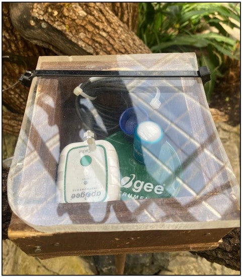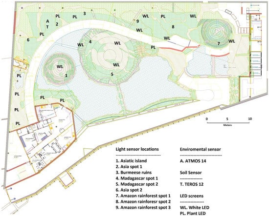 The use of environmental sensors for the measurement of environmental parameters is already carried out in indoor horticultural and livestock farms; this has demonstrated the importance of environmental parameter (PAR light, temperature, air relative humidity, etc.) determination for the accurate management of these facilities [,]. On the other hand, studies determining environmental parameters in zoological and botanical facilities are still very limited, with little attention paid to the selection, use and management of the vegetable species, and with few studies reporting the importance of certain environmental parameters for the optimal health and development of animals [,,,]. In livestock and horticultural production facilities, environmental parameter control studies are mainly focused on increasing production and nutritional quality, while in zoological and botanical gardens the main objective of environmental studies should be to improve animal and plant welfare, as well as to generate better criteria for species selection based on these parameters [,,].