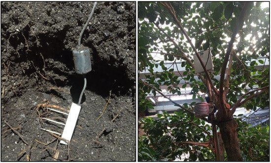 When looking at conductivity, our study detected a marked relationship between conductivity and soil water content (with a correlation of rs = 0.572). Furthermore, Figure 6 allows the visual detection of different peaks in the graphs for both parameters, which is related to the irrigations carried out throughout the year, observing a higher irrigation frequency during the months of March to August and a lower frequency from August to February. The live determination of soil parameters such as temperature, water content, and conductivity will also allow the early diagnosis and prevention of fungal pathologies since there is a direct relationship between these parameters and the appearance of fungal diseases []. A limitation to this study is that only one TEROS12 soil sensor was available during sampling, and therefore we could only determine soil parameters for a fixed location at Biodomo. Future studies with soil sensors placed across different locations will allow a more precise evaluation of soil conditions and if plant requirements are met at the different enclosures. This will allow the design of a detailed and sustainable irrigation schedule. For instance, this efficient irrigation system based on independent soil sensors would provide water only in the locations with a water deficit, always guaranteeing the optimal soil conditions and promoting plant development while saving water.