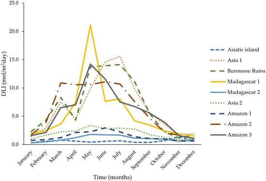 Monthly DLI values and descriptive statistics for the different sampling locations are reported in Table 1. Values recorded for DLI showed statistically significant variations across the different sampling locations, as well as between the different months. Statistically significant differences (p < 0.05; Dunn’s post hoc with Bonnferroni corrections) were detected between the DLI values recorded in the months of June vs. December, June vs. January, June vs. November, July vs. November, May vs. November, May vs. December, and May vs. January. Furthermore, as it can be appreciated in Figure 5, important differences were detected for DLI annual measurements between the locations (Figure 5). These differences were statistically significant (Dunn’s post hoc with Bonnferroni corrections) between: Amazon rainforest spot 1 vs. Amazon rainforest spot 2 (p < 0.05), Amazon rainforest spot 1 vs. Amazon rainforest spot 2 (p < 0.05), Amazon rainforest spot 3 vs. Asiatic island (p < 0.01), Amazon rainforest spot 1 vs. Asia spot 1 (p < 0.05), Amazon rainforest spot 2 vs. Asiatic Island (p < 0.01), Asia spot 1 vs. Asiatic island (p < 0.01), Asia enclosure spot 2 vs. Asiatic island (p < 0.05), Madagascar enclosure spot 1 vs. Asiatic island (p < 0.01), Burmese ruins vs. Asiatic island (p < 0.01), Amazon rainforest spot 3 vs. Madagascar enclosure spot 2 (p < 0.01), Amazon rainforest spot 2 vs. Madagascar enclosure spot 2 (p < 0.01), Asia spot 1 vs. Madagascar enclosure spot 2 (p < 0.01), Amazon rainforest spot 1 vs. Burmeese ruins (p < 0.05), Madagascar enclosure spot 2 vs. Burmeese ruins (p < 0.05), and Madagascar enclosure spot 1 vs. Madagascar enclosure spot 2 (p < 0.05). Statistical comparison between the different months across the sampling spots was not possible due to a small number of samples per month and spot (3–4 samples) associated with the rotating system and limited by the availability of only one DLI sensor.