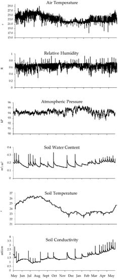 3.2. Variations in Air Temperature, Air Relative Humidity, Ambient Pressure, Soil Water Content, Soil Temperature and Conductivity