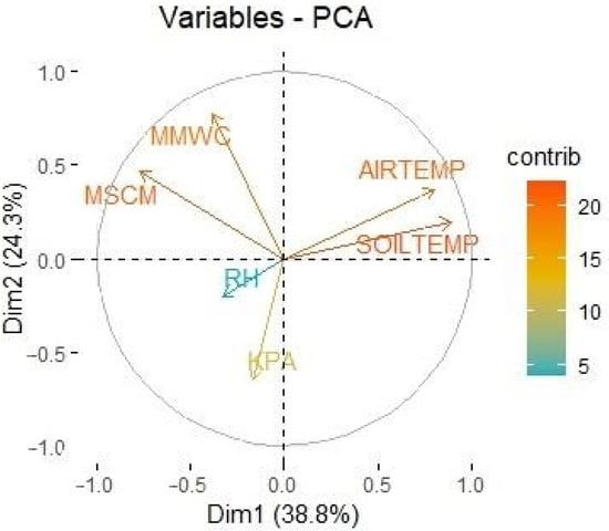 Principal component analysis (PCA) of the six different variables measured by the ATMOS14 and TEROS12 sample probes: AIRTEMP, air temperature (°C); SOILTEMP, soil temperature (°C); MSCM, conductivity (mS/cm); MMWC, soil water content (m3/m3); RH, relative humidity (RH); KPA, atmospheric pressure (kPa). X–Y axis corresponds to principal component 2 (Dim 2)—principal component 1 (Dim 1). The different colors represent the percentage of contribution (contrib) of each variable (environmental parameter) to data variance.