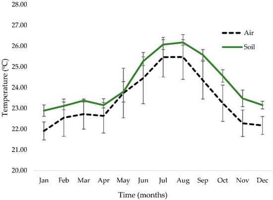 Mean ± SD air and soil temperatures at Biodomo—Parque de las Ciencias de Granada. Statistically significant differences (p < 0.01; Mann–Whitney U test) were detected between air and soil temperature in all months except May (p = 0.027).