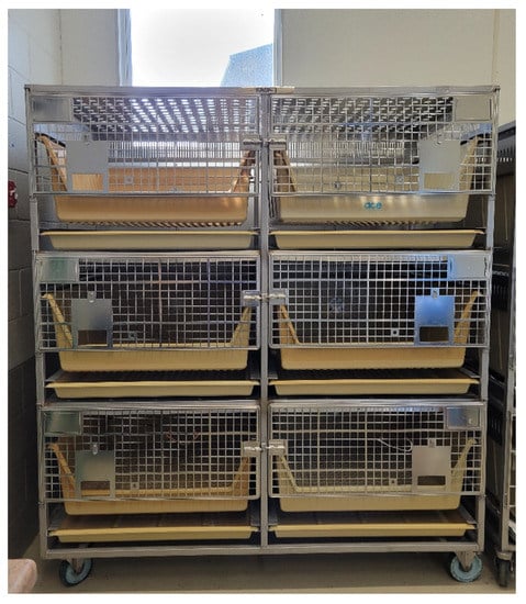 Laboratory-style caging racks. This style of caging, where waste falls through into the liner below, provides a more hygienic space for the rabbits and allows for a much less invasive cleaning style.