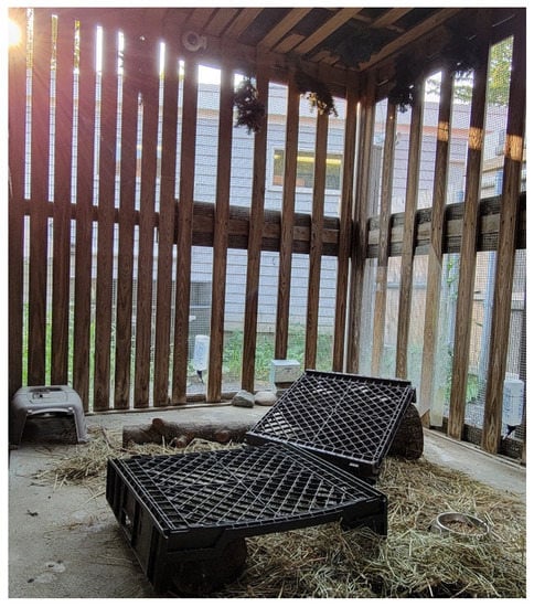 Breeding takes place in one of four covered outdoor breeding pens [Figure 2] which are approximately 10′x15′ with a dig proof concrete slab floor and fully meshed sides. Visual barriers are in place between pens to decrease aggression between males. An area of timothy hay is maintained in the center of each pen for both bedding and food. Several hides of assorted sizes are provided for the animals to take shelter together or separately. There are multiple sources for water, grain, and woody browse for them to choose from. Pens are cleaned daily: soiled hay is removed and replaced with new, floors are swept, grain sources replenished, water bottles replaced, and fresh greens are provided. Each pen is fitted with 2 cameras on opposing walls with overlapping fields of view. Camera footage is utilized by students at URI for research.