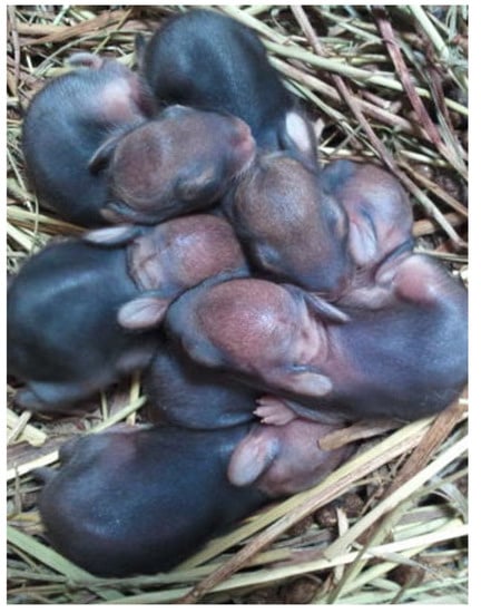 A dam with her 15-day old kits. The kits will remain with the dam for another 8 days before weaning.
