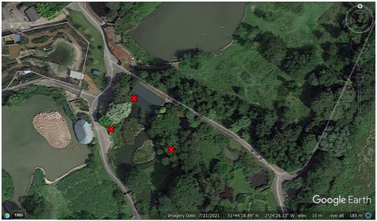 Map of the lesser flamingo enclosure at WWT Slimbridge with red crosses showing the placement of the three remote cameras (one inside the house and two covering the outside enclosure). Flamingos can be seen as white dots on the centre island (the landscape feature used for judging the range of motion activation for each outside camera).