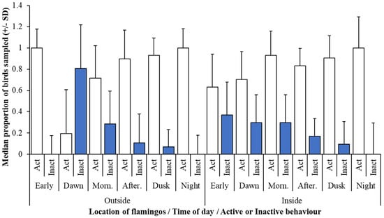 Captive greater flamingos showed increased rates of active behaviours in the later afternoon (from 15:00), early evening (from 18:00 to 20:00) and early morning (around 04:00 and 05:00) []. This research also identified significant differences in enclosure zone usage, whereby birds used pool areas more overnight and terrestrial areas more during daylight hours. Such findings are important for the development of best practice husbandry guidelines as well as for optimal indoor housing as access to water overnight is clearly important to natural behaviour performance (and therefore bird welfare).