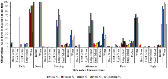 Figure 3 showed that when birds has outdoor access overnight, flamingos used enclosure zones that they were rarely seen in during the day (e.g., front grassed area). The highest percentage of courting birds in the early morning showed that the front grass was used for courtship display, then the islands in the pool and then into the water at dusk. Occurrences of foraging are high for all times of the day, but especially in the water during hours of darkness (Early and Night). The full output from the Poisson regression is found in the Supplementary Materials (Table S1) and this analysis showed that for each behaviour, there was a significant relationship between enclosure zone, time of day and month of observation on flamingo activity across daylight and nocturnal hours (Table 4).