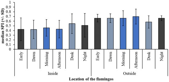 Large variation in the enclosure usage illustrated by Figure 4 and Figure 5 may be a factor of the bird’s social activities. A majority of flamingos choosing to perform the same behaviour as the other birds around them may have caused the outliers on these graphs at specific times. Captive flamingos will also move away from their main social group and act independently to conspecifics at different times of the day []. Consequently, the complex nature of flamingo social behaviour and the attraction strength of the main flock may be reflected in the variation expressed in this graph. Enclosure zoning (i.e., the number of zones defined and their size) can also influence calculated SPI values and therefore has a bearing on the accuracy of enclosure usage assessment []. Further research should consider the number of zones that a flamingo enclosure is divided into and compare different zone number within the same enclosure to evaluate the degree of variation in calculated SPI values.