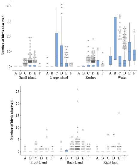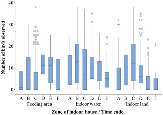 Count of birds in different indoor zones by time of day. A = Early; B = Dawn; C = Morning; D = Afternoon; E = Dusk; F = Night. * show outliers.