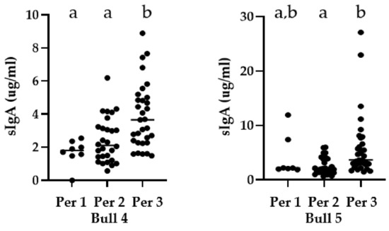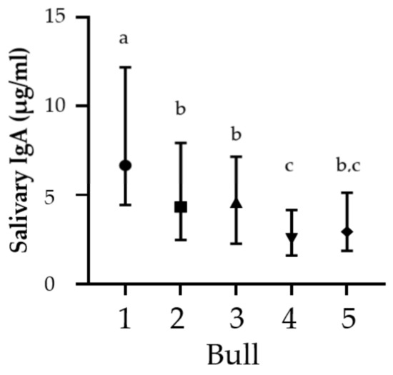 Median (and interquartile ranges) of secretory IgA concentrations for five bulls over the full study period. Superscript letters indicate significant differences Kruskal–Wallis test (p < 0.05).