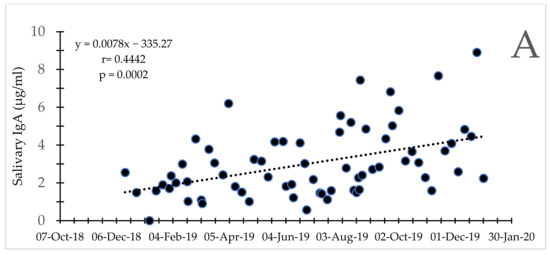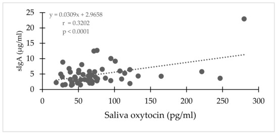 Saliva and serum samples were not always collected on the same day, therefore correlations for sIgA and serum cortisol concentrations were calculated in two ways: between samples collected on the same day (from the same bull) and between averages for the same week. The present study did not find a correlation between sIgA and serum cortisol collected on the same day (n = 187 paired values; p = 0.394), or for samples collected in the same week (n = 218 paired values; p = 0.270). When all samples were analyzed together, sIgA correlated strongly with salivary oxytocin, but not with cortisol or testosterone (as a proxy for musth; Table 4). Testosterone strongly correlated with cortisol, in agreement with previous studies [10,45,46].
