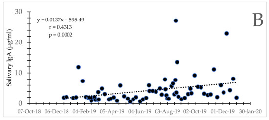 Salivary immunoglobulin A was quantified by an enzyme immunoassay (EIA) previously validated for elephants [44]. The substrate procedures were slightly modified as follows to improve assay consistency. Briefly, one phosphate-citrate capsule (Sigma P-4922) was broken, and contents were allowed to dissolve in 100 mL of distilled water for 10 min in a dark cabinet. Two high kinetic 3,3′,5,5′-tetramethylbenzidine (TMB) peroxidase (Sigma T-3405) tablets were dissolved in 20 mL of this phosphate-citrate buffer per plate in the dark. 200 µL of the substrate solution was added to all the wells and covered and allowed to incubate in the dark at room temperature for 10–12 min. A polyclonal rabbit anti-human IgA antibody (A0262, Dako, Glostrup, Denmark) was diluted to a working concentration of 10 mg/L in phosphate-buffered saline (0.01 M phosphate buffer, 0.15 M NaCl, pH 7.2) and 100 μL added per well to a 96-well microtiter plate (Costar, Corning Life Sciences, Tewkesbury, MA, USA). After incubation overnight at 4 °C, plates were aspirated and washed three times with PBS-T. Standards (0.39–100 µg/L), high and low concentration controls made using sIgA from human colostrum (I2636, Sigma Aldrich, St. Louis, MO, USA), and biological samples diluted as (add dilutions) were added in duplicate (50 µL). Following incubation at room temperature (RT) for 2 h on a plate shaker set to 500 RPM, plates were aspirated and washed three times with PBS-T. A polyclonal rabbit anti-human IgA antibody conjugated to horseradish peroxidase (HRP; P0216, Dako, Glostrup, Denmark) was diluted 1:2000 in PBS-T and 100 µL added per well before incubation at RT for 1 h on a plate shaker set to 500 RPM. After a final (3 times) wash step, 200 μL of the TMB substrate was added per well and incubated in the dark for 10 min at RT. Finally, the reaction was stopped with 50 μL stop solution (1N HCl) and the absorbance measured at 450 nm with a reference of 570 nm using a microplate reader (Filtermax F5, Molecular Devices, Sunnyvale, CA, USA). Samples were run in duplicated and diluted 1:200 to run on the assay. The assay sensitivity was 3.12 µg/mL, and the inter-assay coefficients of variation were <10% (12 assays).
