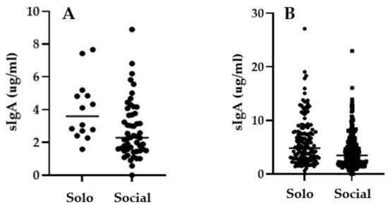 Secretory IgA concentrations in (A) Asian elephant Bull 4 in solo and social situations, and (B) in all five bulls in solo and social situations, excluding musth periods during socialization of two all-male groups.