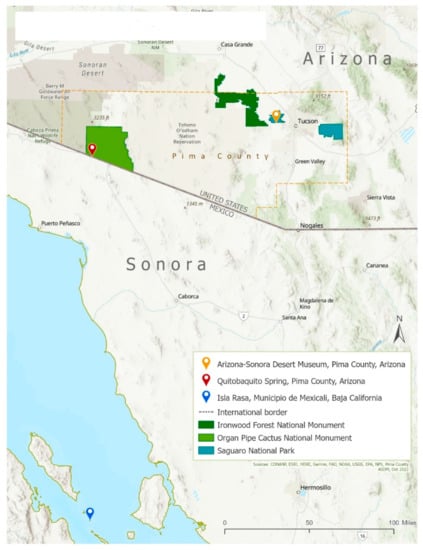 The Desert Museum’s mission is to inspire people to live in harmony with the natural world by fostering love, appreciation, and understanding of the Sonoran Desert. The Sonoran Desert is one of the most diverse deserts in the world due to its varied geography, topography, and bimodal rainfall pattern, with summer and winter rainy seasons []. A variety of cultures have lived in and shaped the landscape and biodiversity for at least 13,000 years []. As seen in Figure 2, the Sonoran Desert region covers approximately 260,000 km2 and includes several biotic communities, which are sometimes interlaced and alternated along the undulating basins and mountain ranges []. It also surrounds the extremely diverse and productive Gulf of California, with over 900 islands and islets []. The Sonoran Desert encompasses most of southern Arizona in the U.S., the northwestern part of Sonora, Mexico, and most of the Baja California Peninsula. It also extends slightly into southeastern California, U.S. It is home to a relatively high number of vulnerable species due to its relatively high biodiversity, habitat degradation, introduced species and pathogens, and the impacts of climate change [,]. Over its history, the Museum has partnered with university researchers, non-governmental organizations, indigenous communities and nations, and local, state, and federal agencies in the U.S. and Mexico to conserve the region’s rich biological heritage.